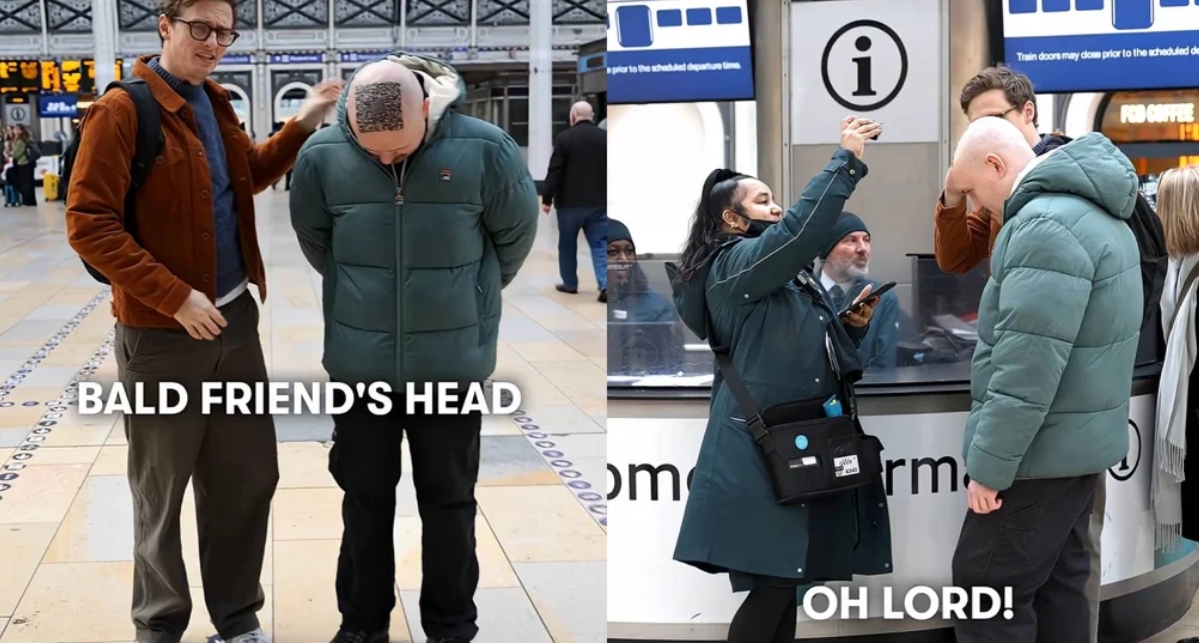 Partiendo de esta premisa decidido imprimir el código QR de su billete en la cabeza de un amigo suyo calvo. Con el QR ya dibujado en la cabeza se fueron a los tonos de la estación y como es lógico los empleados no daban crédito a la situación.