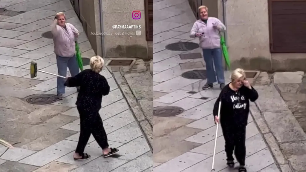 En la grabación, se puede ver como una de ellas se acerca a la otra mujer levantando una escoba mientras la otra, se defiende con un spray insecticida y un paraguas cerrado para poder utilizar en caso de que fuese necesario.